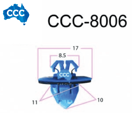 Car Clip Company car clips and Automotive Clips for a Toyota Blue Body Flare Clips 25pcs CCS-8006 Clip Company manufactures high quality car clips and automotive clips, rivets car clips, scrivets car clips, fasteners, panel clips, Grommet screws, exterior moulding clips, door trim clips, Christmas tree clips. For fast Australia wide delivery phone 0499 001004.