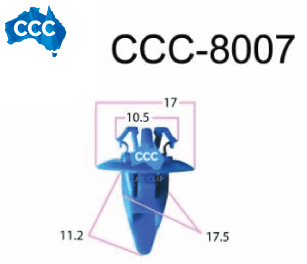 Car Clip Company car clips and Automotive Clips for a Toyota Blue Body Flare Clips 25pcs CCS-8007 Clip Company manufactures high quality car clips and automotive clips, rivets car clips, scrivets car clips, fasteners, panel clips, Grommet screws, exterior moulding clips, door trim clips, Christmas tree clips. For fast Australia wide delivery phone 0499 001004.