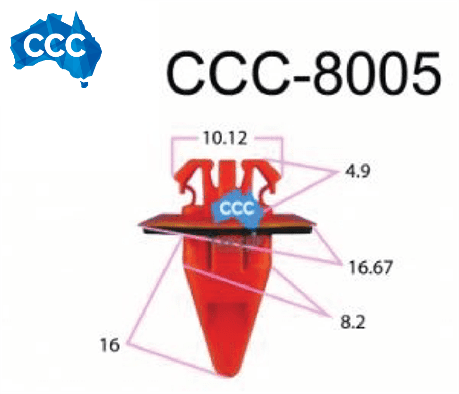 Car Clip Company car clips and Automotive Clips for a Toyota Red Body Flare Clips 25pcs CCS-8005 Clip Company manufactures high quality car clips and automotive clips, rivets car clips, scrivets car clips, fasteners, panel clips, Grommet screws, exterior moulding clips, door trim clips, Christmas tree clips. For fast Australia wide delivery phone 0499 001004.